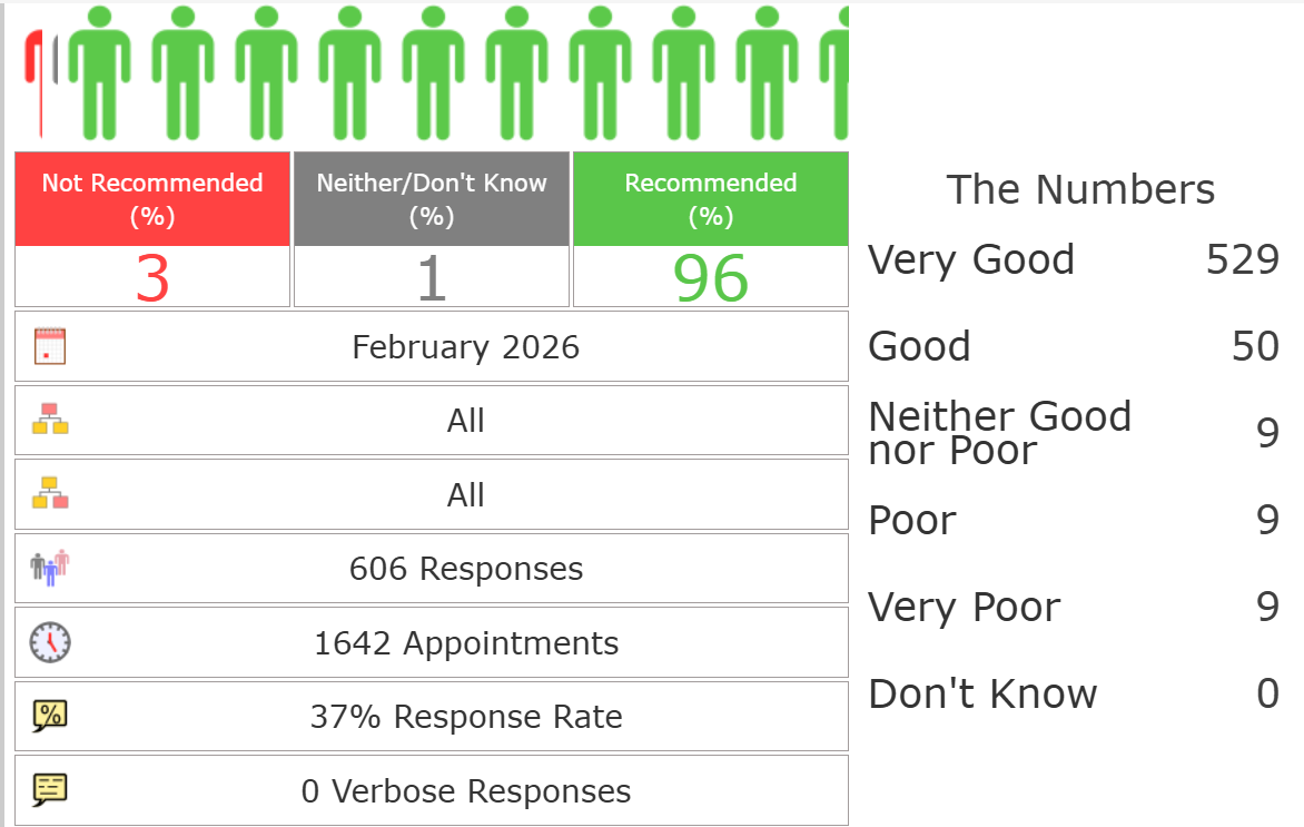Since you had all bad press last year I always just feel now that in general people just don't take time to say nice things anymore and just like to moan. I called the surgery yesterday afternoon, after approx an 8 min wait I spoke to a friendly receptionist and was seen by Dr Sumner just over an hour later - AMAZING SERVICE. Dr Sumner was friendly, checked me over as I guess is normal for my appointment but was also just so friendly and caring and I didn't feel rushed. As a family we have been with the surgery over 17 years and we can't ever fault it. Anyway I think you're all brilliant and thank you as always. - March 2024